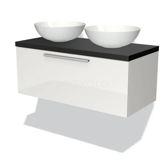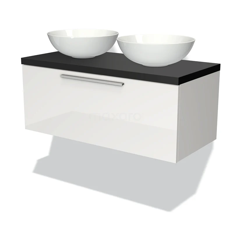 Modulo Plato Badmöbel mit Aufsatzwaschbecken | 100 cm Hochglanz Weiß Flach front Matt Schwarz blatt 1 Schublade