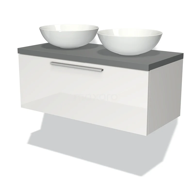 Modulo Plato Badmöbel mit Aufsatzwaschbecken | 100 cm Hochglanz Weiß Flach front Mittelgrau blatt 1 Schublade