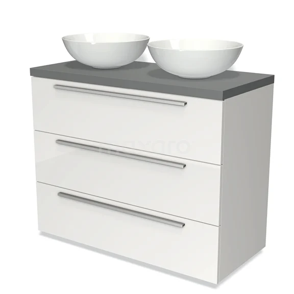 Modulo Plato Badmöbel mit Aufsatzwaschbecken | 100 cm Hochglanz Weiß Flach front Mittelgrau blatt 3 Schubladen