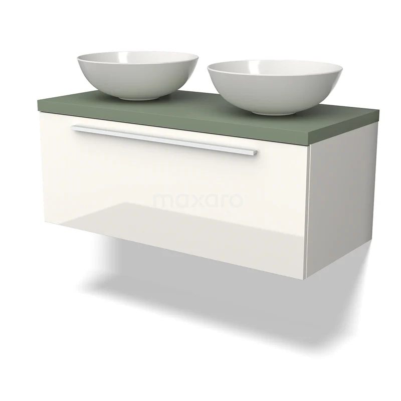 Modulo Plato Badmöbel mit Aufsatzwaschbecken | 100 cm Hochglanz Weiß Flach front Salbeigrün blatt 1 Schublade