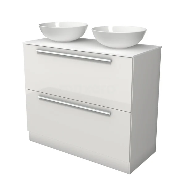 Modulo Plato Badmöbel mit Aufsatzwaschbecken | 100 cm Hochglanz Weiß Flach front Solid Surface blatt 2 hohe Schubladen übereinanderliegend