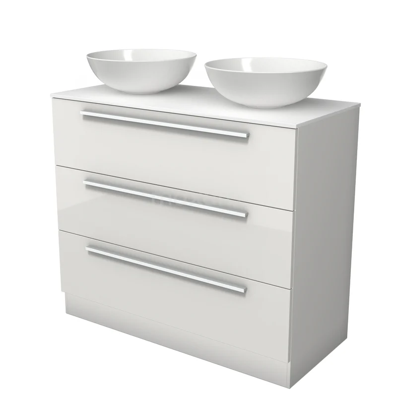 Modulo Plato Badmöbel mit Aufsatzwaschbecken | 100 cm Hochglanz Weiß Flach front Solid Surface blatt 3 stehende Schubladen