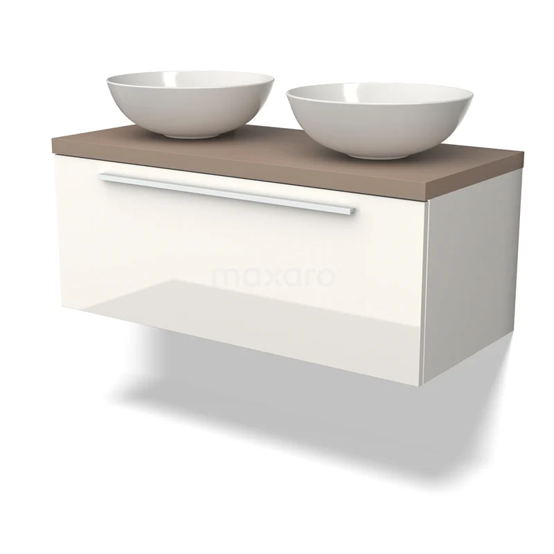 Modulo Plato Badmöbel mit Aufsatzwaschbecken | 100 cm Hochglanz Weiß Flach front Taupe blatt 1 Schublade