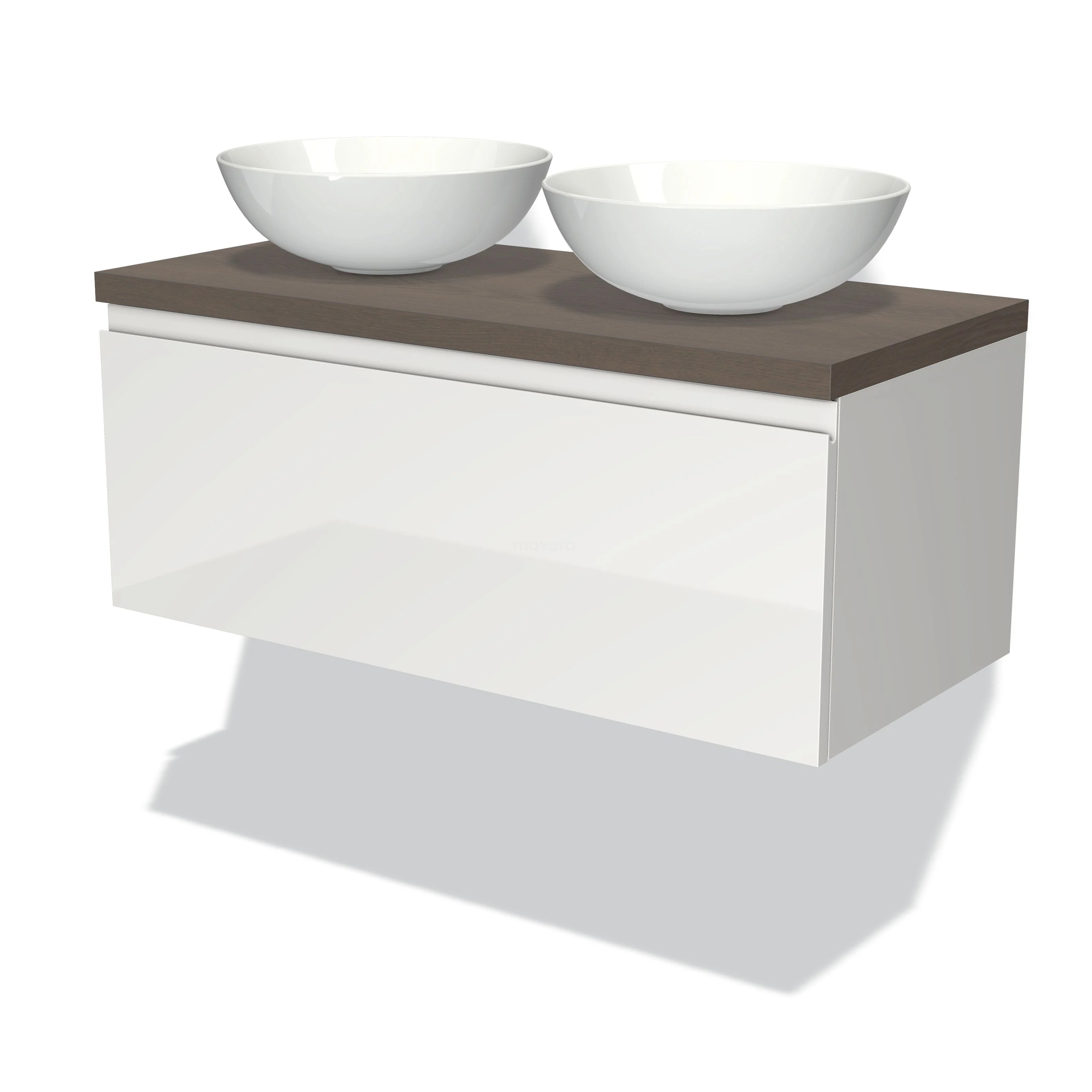 Modulo Plato Badmöbel mit Aufsatzwaschbecken | 100 cm Hochglanz Weiß Grifflos front Dunkelbraune Eiche blatt 1 Schublade