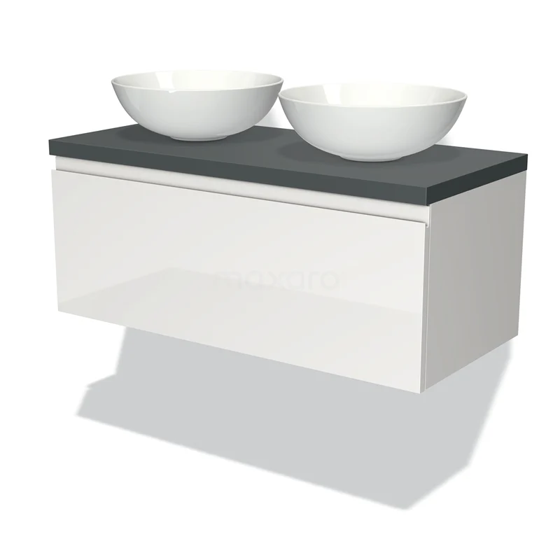 Modulo Plato Badmöbel mit Aufsatzwaschbecken | 100 cm Hochglanz Weiß Grifflos front Dunkelgrau blatt 1 Schublade