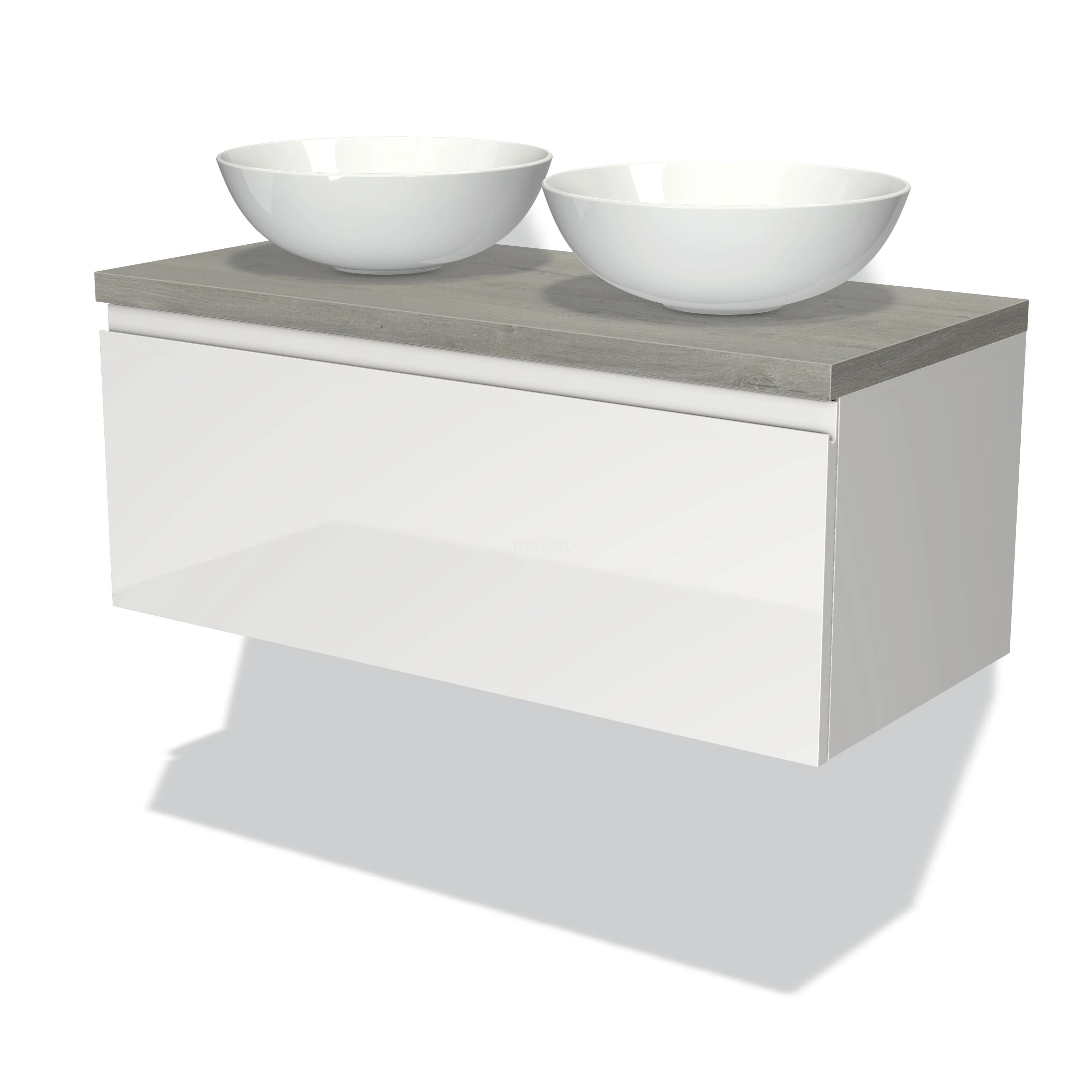 Modulo Plato Badmöbel mit Aufsatzwaschbecken | 100 cm Hochglanz Weiß Grifflos front Graue Eiche blatt 1 Schublade