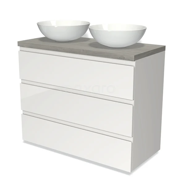 Modulo Plato Badmöbel mit Aufsatzwaschbecken | 100 cm Hochglanz Weiß Grifflos front Graue Eiche blatt 3 Schubladen