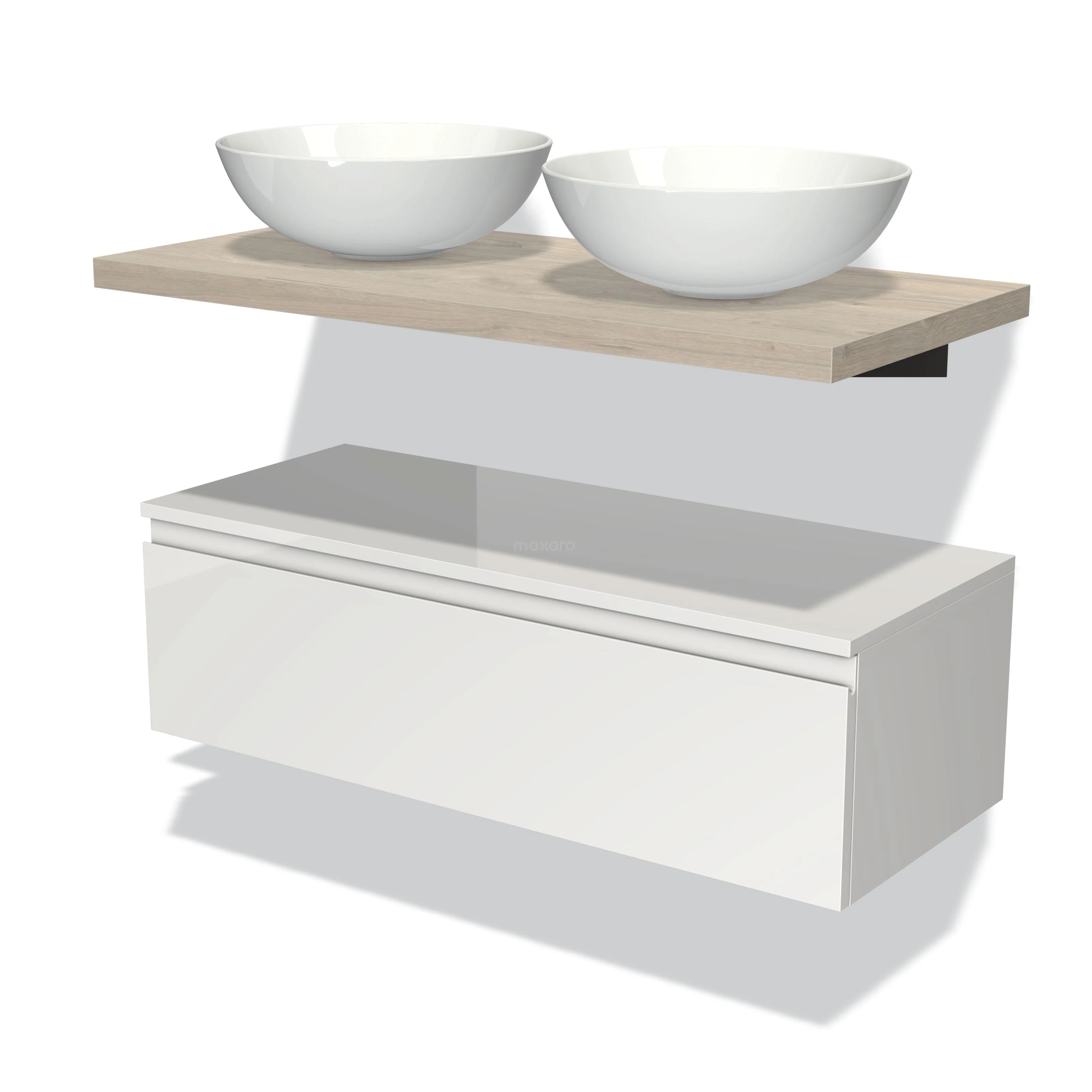 Modulo Plato Badmöbel mit Aufsatzwaschbecken | 100 cm Hochglanz Weiß Grifflos front Hellgraue Eiche blatt Tief hängend