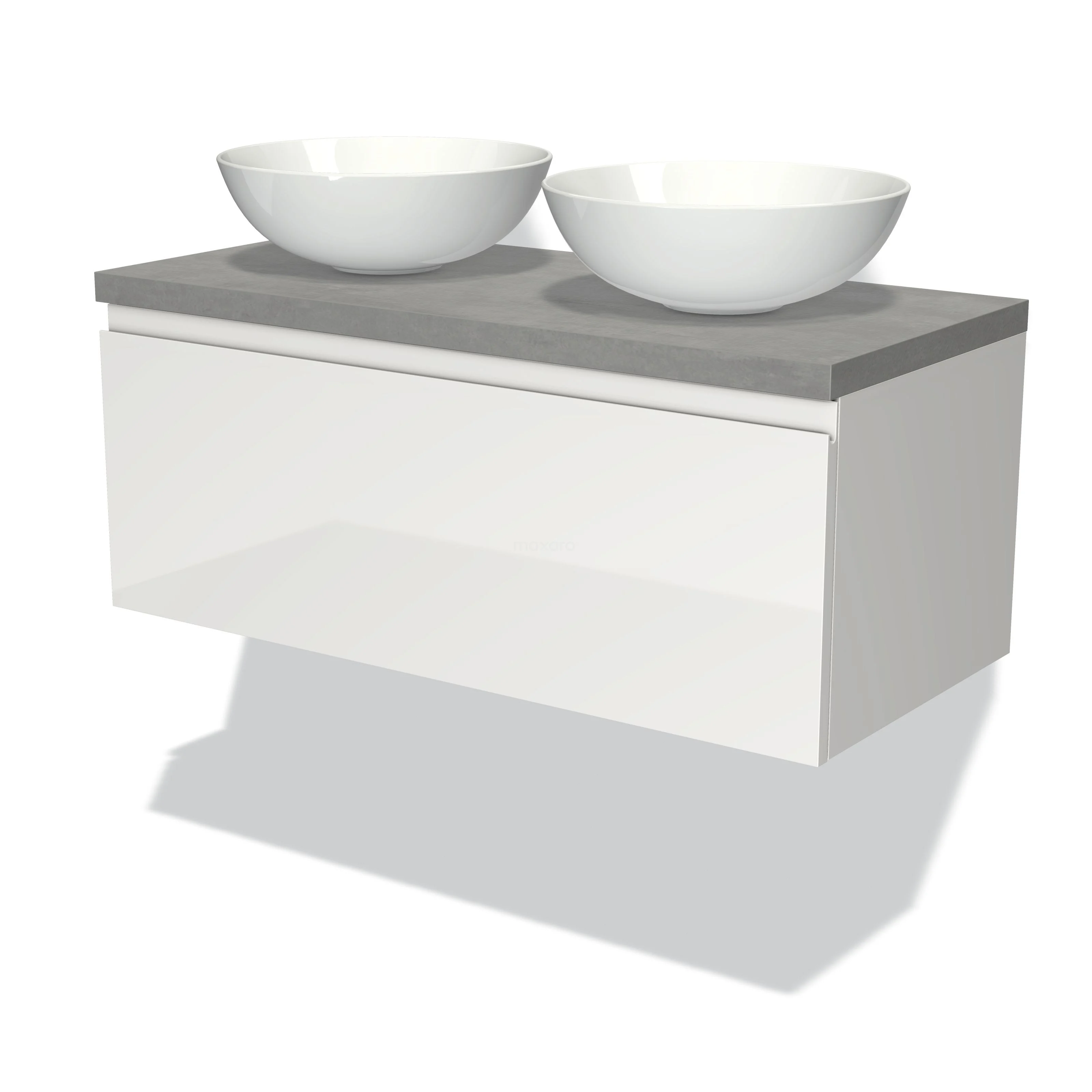 Modulo Plato Badmöbel mit Aufsatzwaschbecken | 100 cm Hochglanz Weiß Grifflos front Hellgrauer Beton blatt 1 Schublade