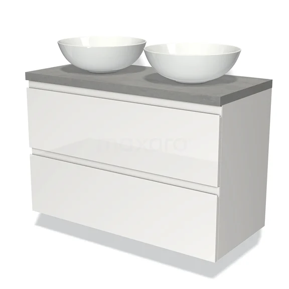 Modulo Plato Badmöbel mit Aufsatzwaschbecken | 100 cm Hochglanz Weiß Grifflos front Hellgrauer Beton blatt 2 übereinanderliegende Schubladen