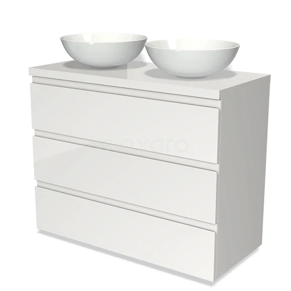 Modulo Plato Badmöbel mit Aufsatzwaschbecken | 100 cm Hochglanz Weiß Grifflos front Hochglanz Weiß blatt 3 Schubladen