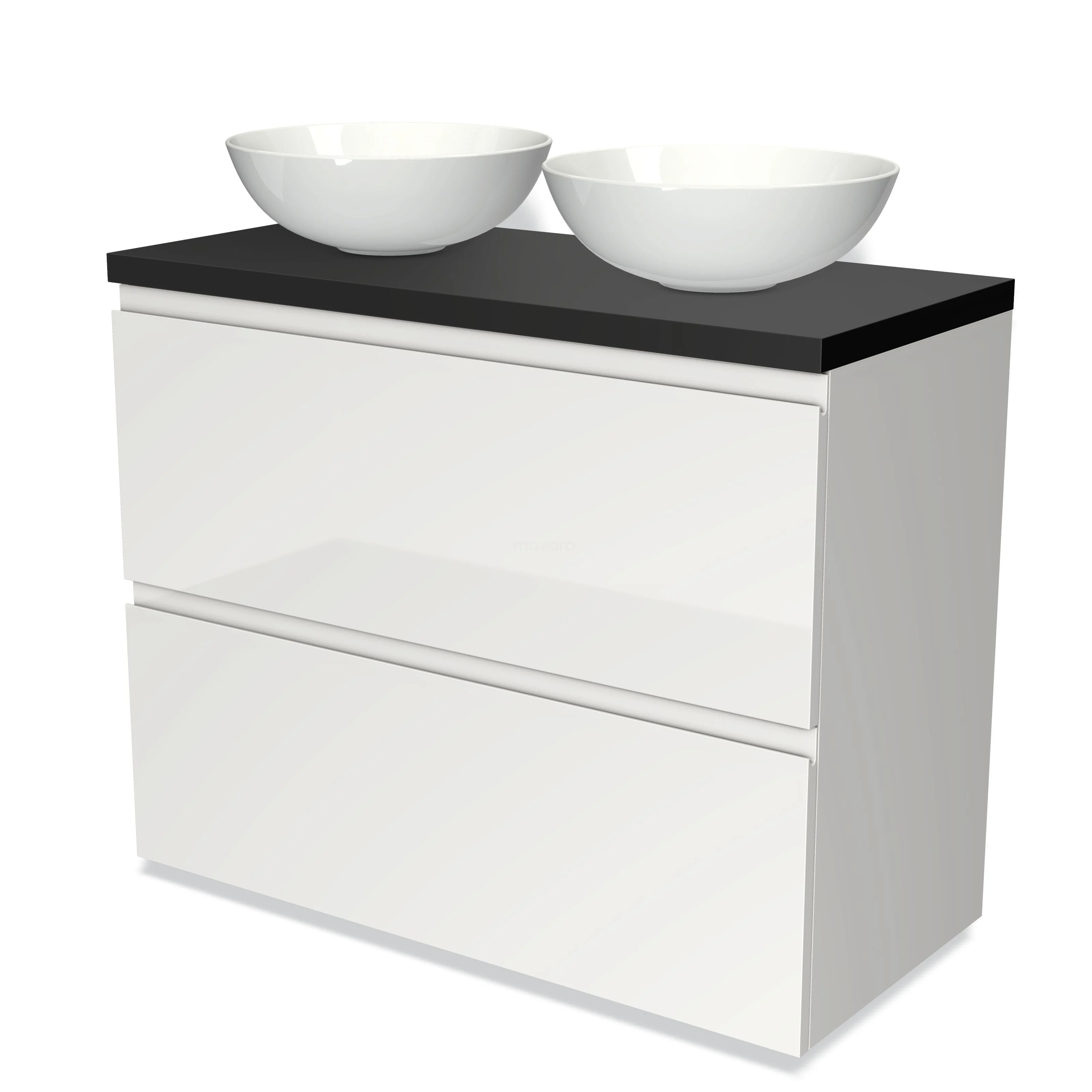 Modulo Plato Badmöbel mit Aufsatzwaschbecken | 100 cm Hochglanz Weiß Grifflos front Matt Schwarz blatt 2 hohe Schubladen übereinanderliegend