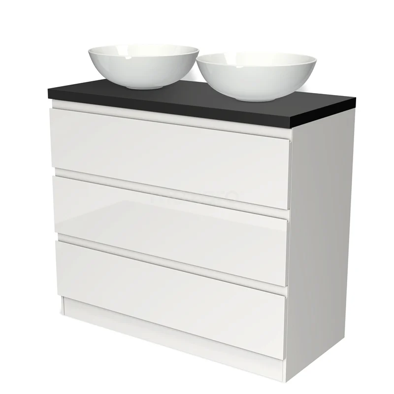 Modulo Plato Badmöbel mit Aufsatzwaschbecken | 100 cm Hochglanz Weiß Grifflos front Matt Schwarz blatt 3 stehende Schubladen