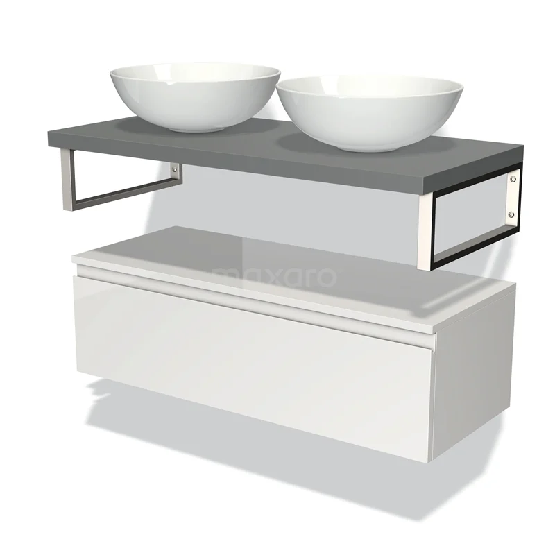 Modulo Plato Badmöbel mit Aufsatzwaschbecken | 100 cm Hochglanz Weiß Grifflos front Mittelgrau blatt Tief hängend