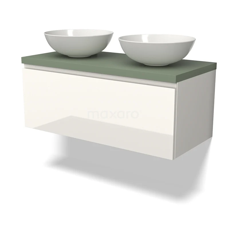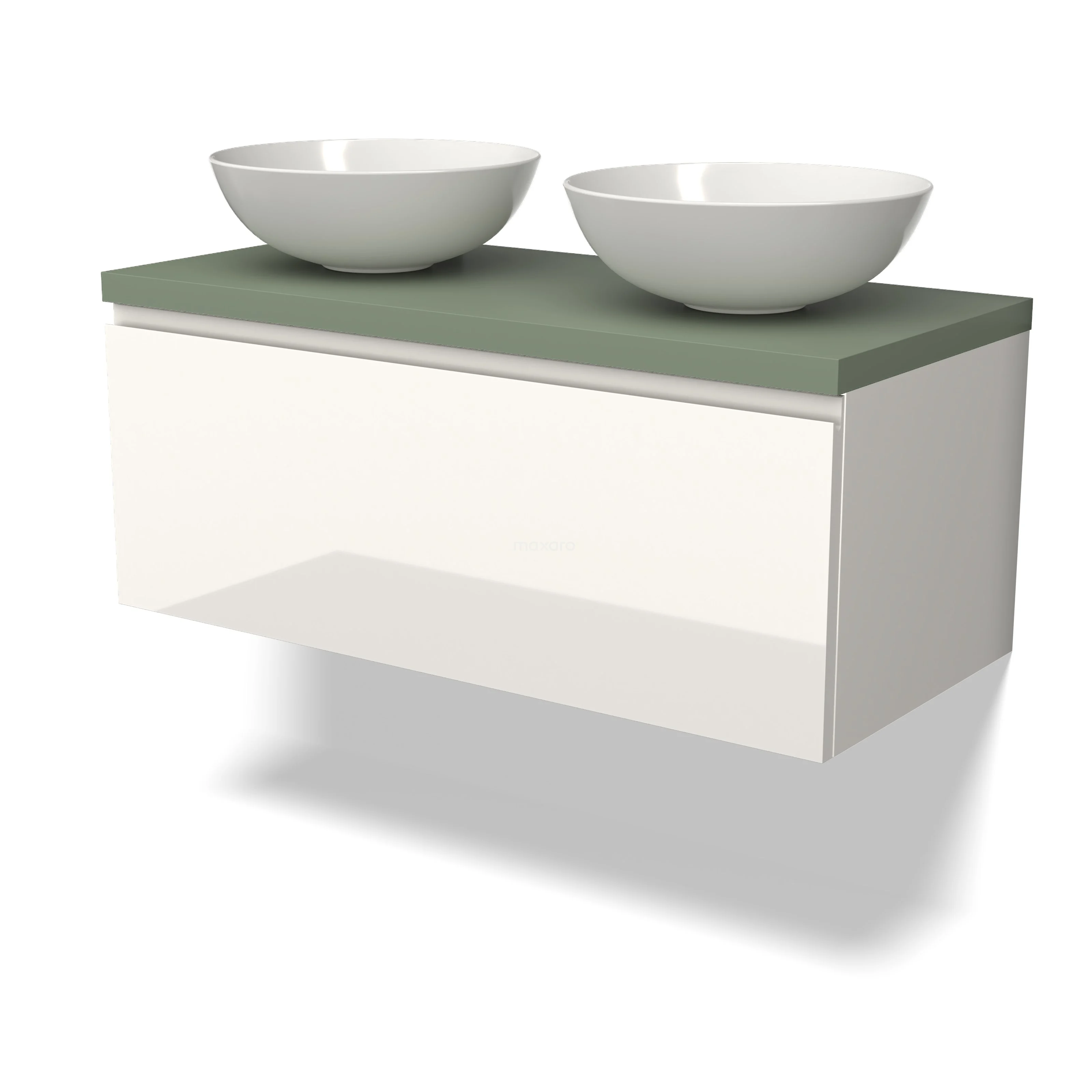 Modulo Plato Badmöbel mit Aufsatzwaschbecken | 100 cm Hochglanz Weiß Grifflos front Salbeigrün blatt 1 Schublade