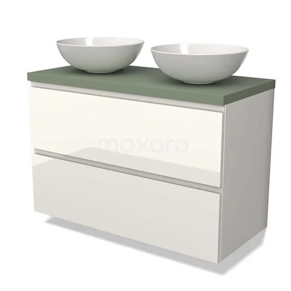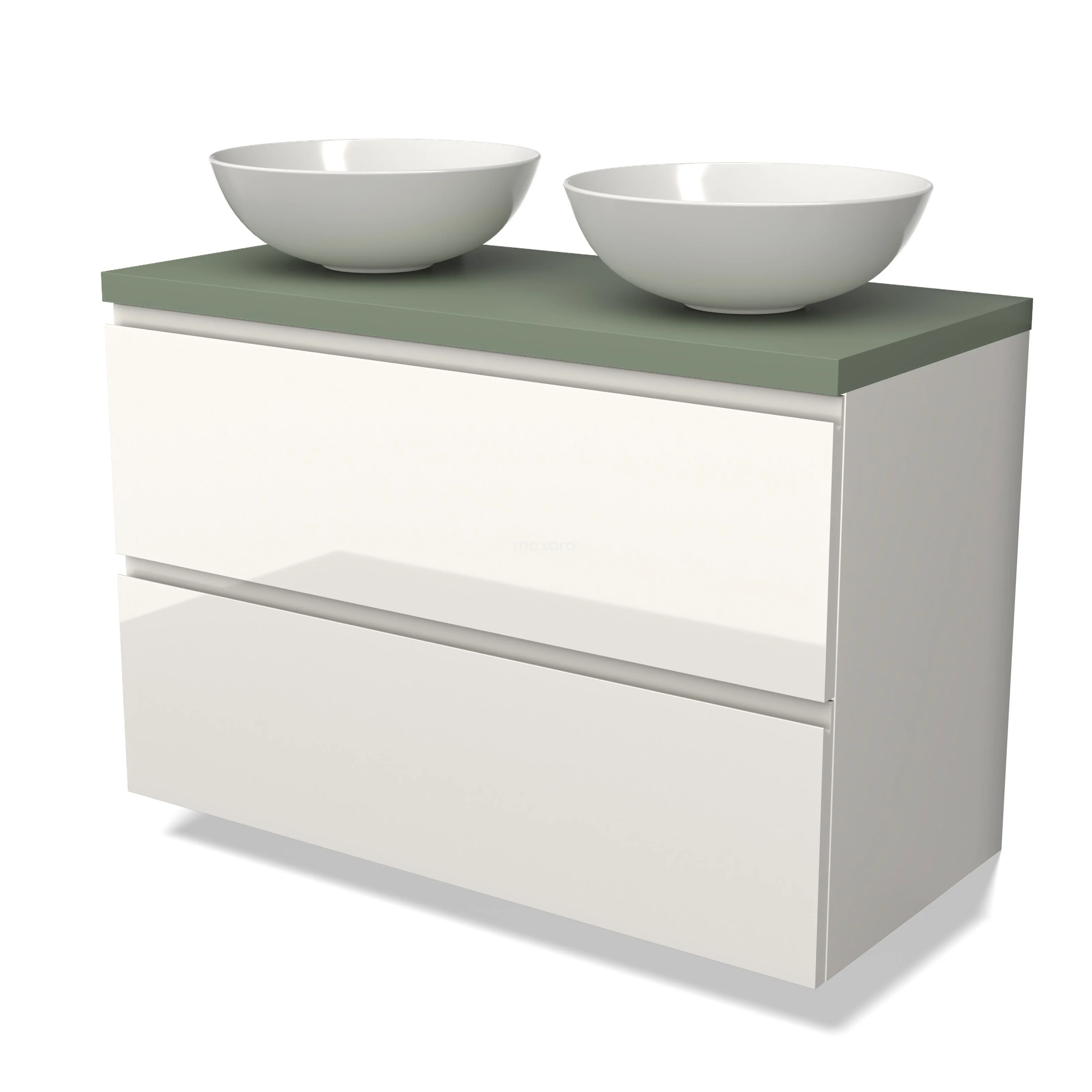 Modulo Plato Badmöbel mit Aufsatzwaschbecken | 100 cm Hochglanz Weiß Grifflos front Salbeigrün blatt 2 übereinanderliegende Schubladen