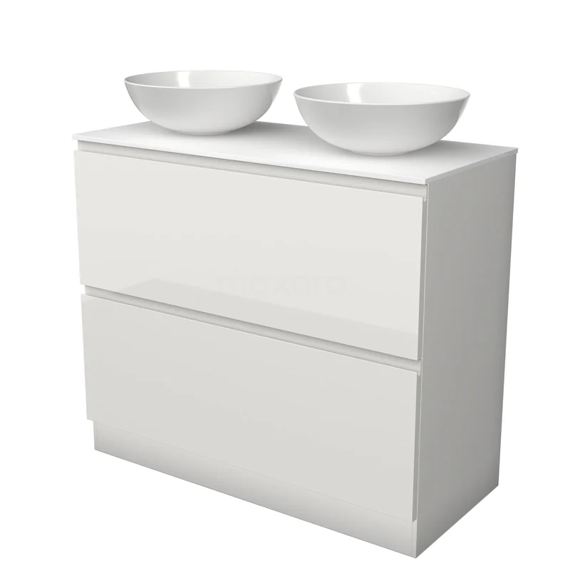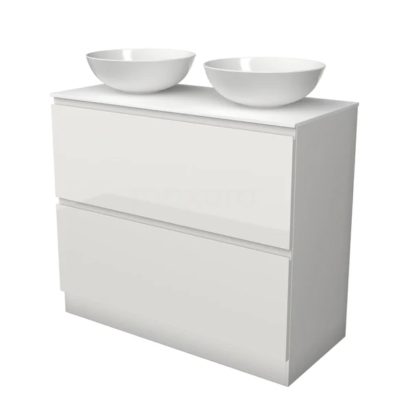 Modulo Plato Badmöbel mit Aufsatzwaschbecken | 100 cm Hochglanz Weiß Grifflos front Solid Surface blatt 2 hohe Schubladen übereinanderliegend