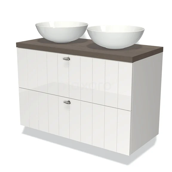 Modulo Plato Badmöbel mit Aufsatzwaschbecken | 100 cm Hochglanz Weiß Lamelle front Dunkelbraune Eiche blatt 2 übereinanderliegende Schubladen