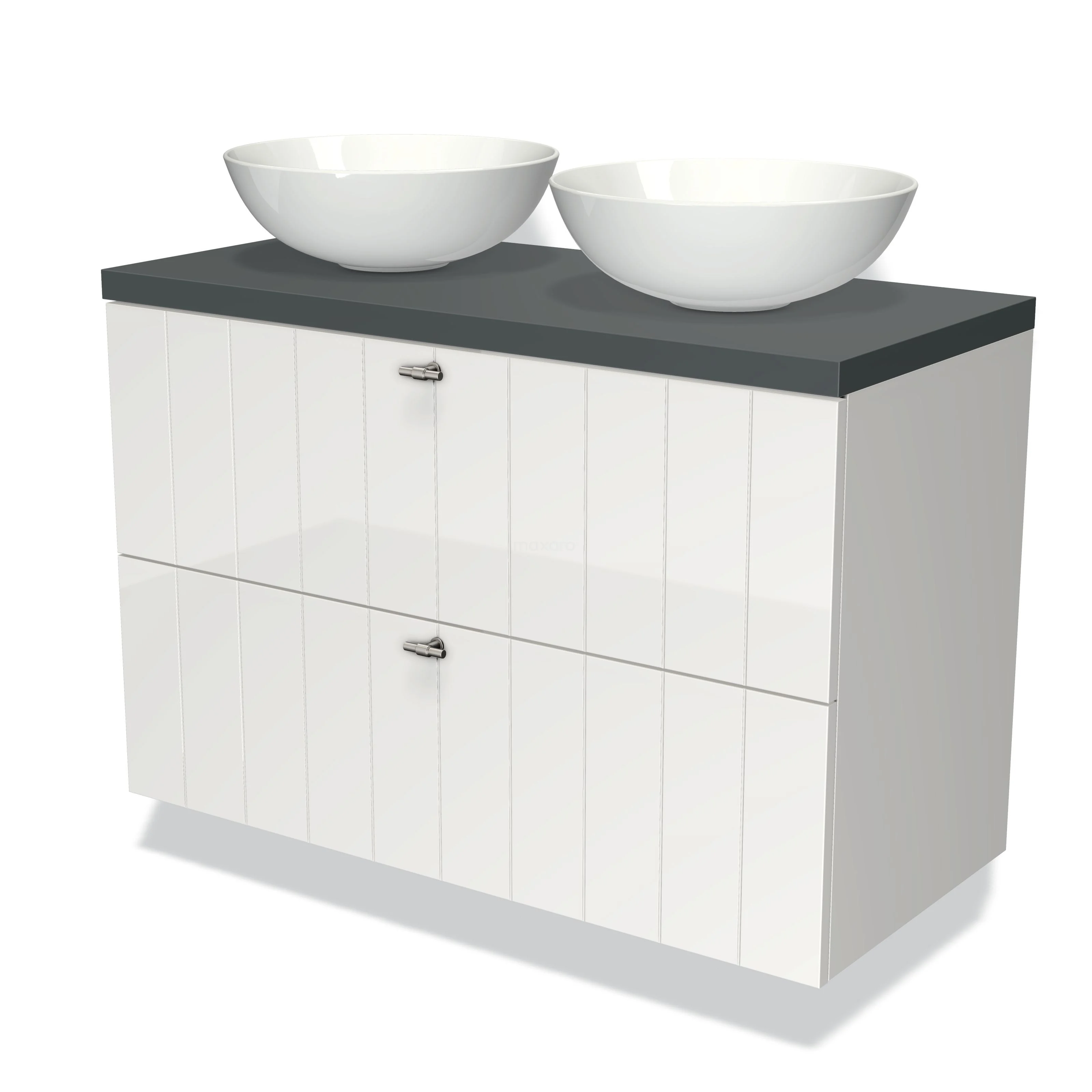 Modulo Plato Badmöbel mit Aufsatzwaschbecken | 100 cm Hochglanz Weiß Lamelle front Dunkelgrau blatt 2 übereinanderliegende Schubladen