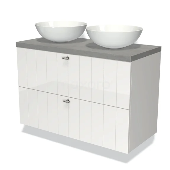 Modulo Plato Badmöbel mit Aufsatzwaschbecken | 100 cm Hochglanz Weiß Lamelle front Hellgrauer Beton blatt 2 übereinanderliegende Schubladen