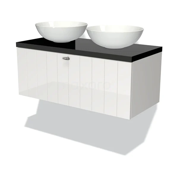 Modulo Plato Badmöbel mit Aufsatzwaschbecken | 100 cm Hochglanz Weiß Lamelle front Hochglanz Schwarz blatt 1 Schublade