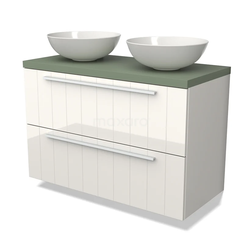 Modulo Plato Badmöbel mit Aufsatzwaschbecken | 100 cm Hochglanz Weiß Lamelle front Salbeigrün blatt 2 übereinanderliegende Schubladen