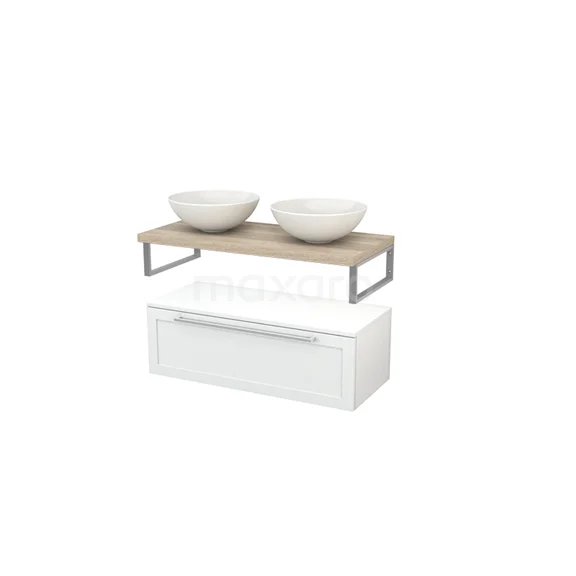 Modulo+ Plato Badmöbel mit Aufsatzwaschbecken | 100 cm Hochglanz Weiß Rahmen front Eiche blatt Tief hängend