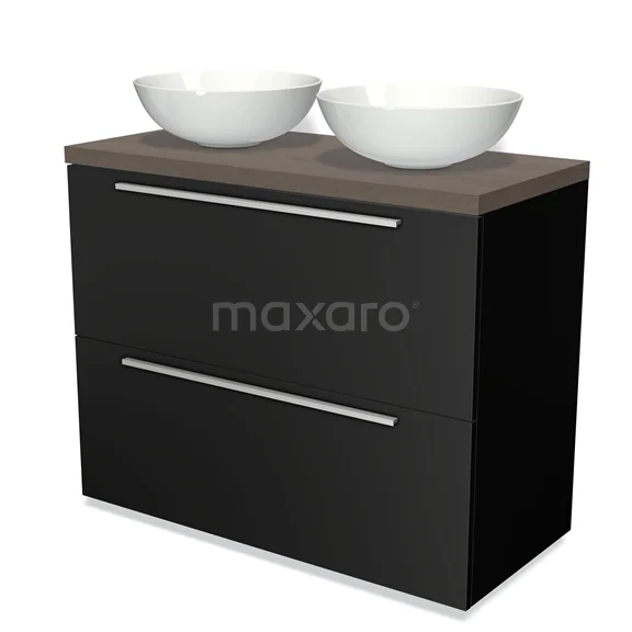Modulo Plato Badmöbel mit Aufsatzwaschbecken | 100 cm Matt Schwarz Flach front Dunkelbraune Eiche blatt 2 hohe Schubladen übereinanderliegend