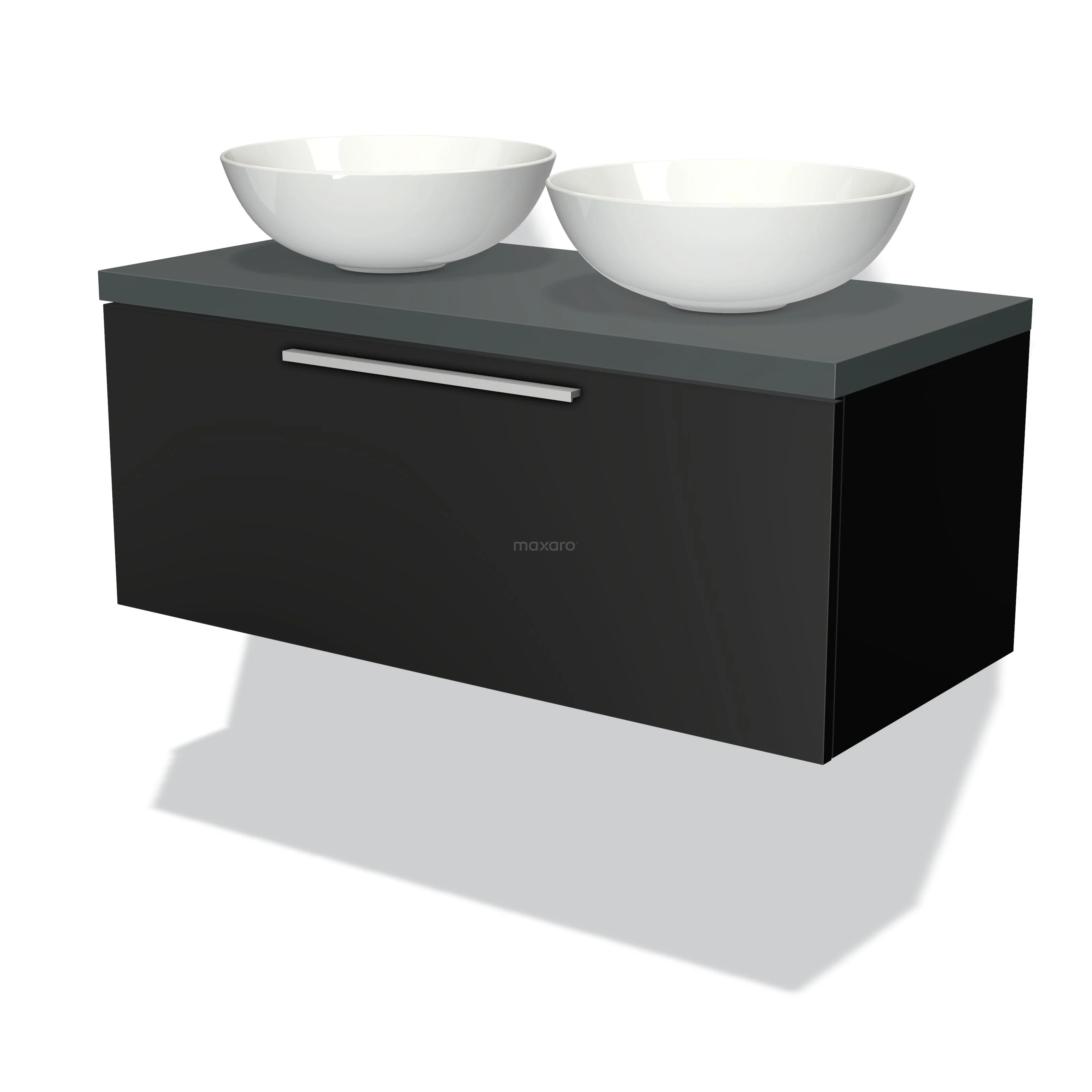 Modulo Plato Badmöbel mit Aufsatzwaschbecken | 100 cm Matt Schwarz Flach front Dunkelgrau blatt 1 Schublade
