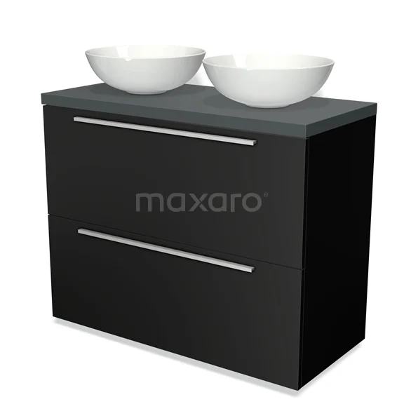 Modulo Plato Badmöbel mit Aufsatzwaschbecken | 100 cm Matt Schwarz Flach front Dunkelgrau blatt 2 hohe Schubladen übereinanderliegend