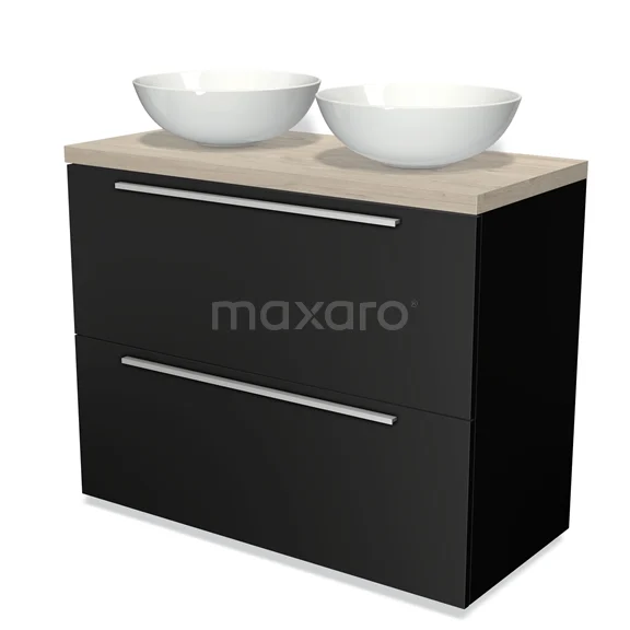 Modulo Plato Badmöbel mit Aufsatzwaschbecken | 100 cm Matt Schwarz Flach front Hellgraue Eiche blatt 2 hohe Schubladen übereinanderliegend