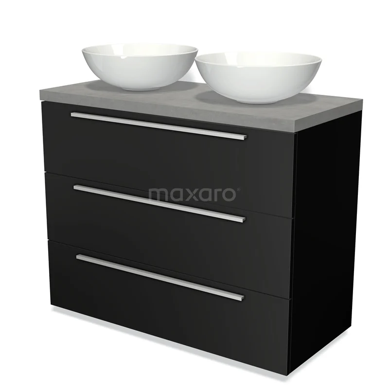 Modulo Plato Badmöbel mit Aufsatzwaschbecken | 100 cm Matt Schwarz Flach front Hellgrauer Beton blatt 3 Schubladen