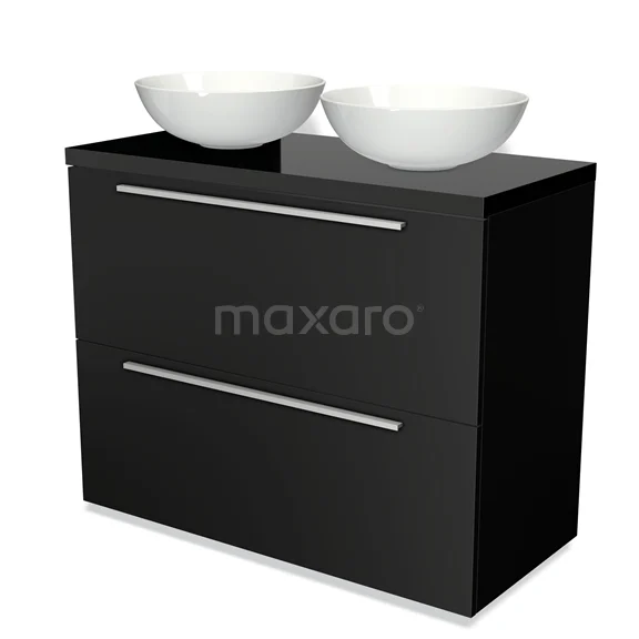 Modulo Plato Badmöbel mit Aufsatzwaschbecken | 100 cm Matt Schwarz Flach front Hochglanz Schwarz blatt 2 hohe Schubladen übereinanderliegend