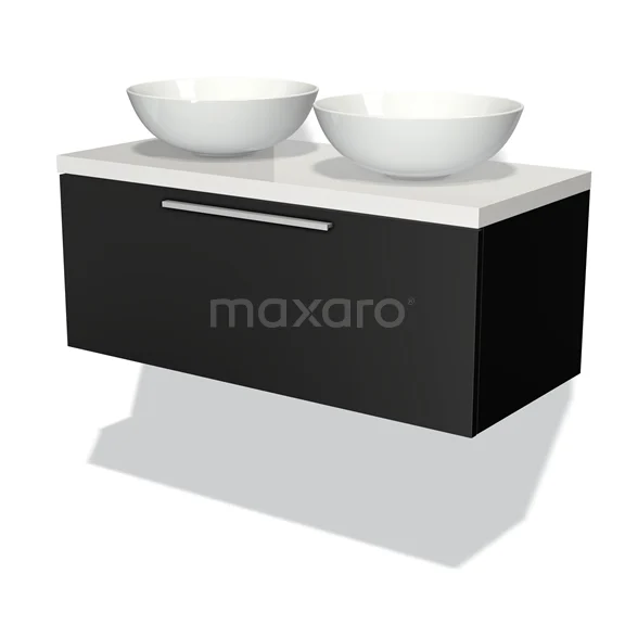 Modulo Plato Badmöbel mit Aufsatzwaschbecken | 100 cm Matt Schwarz Flach front Hochglanz Weiß blatt 1 Schublade