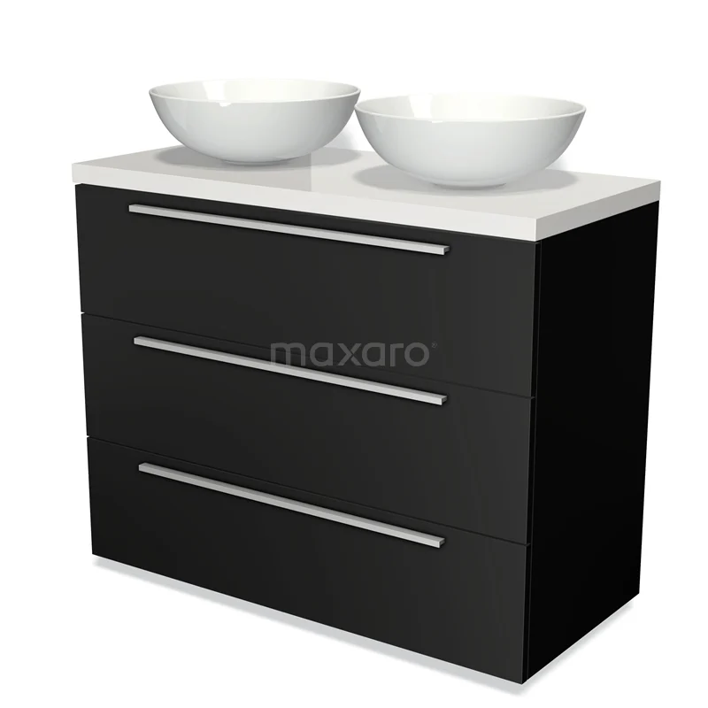 Modulo Plato Badmöbel mit Aufsatzwaschbecken | 100 cm Matt Schwarz Flach front Hochglanz Weiß blatt 3 Schubladen