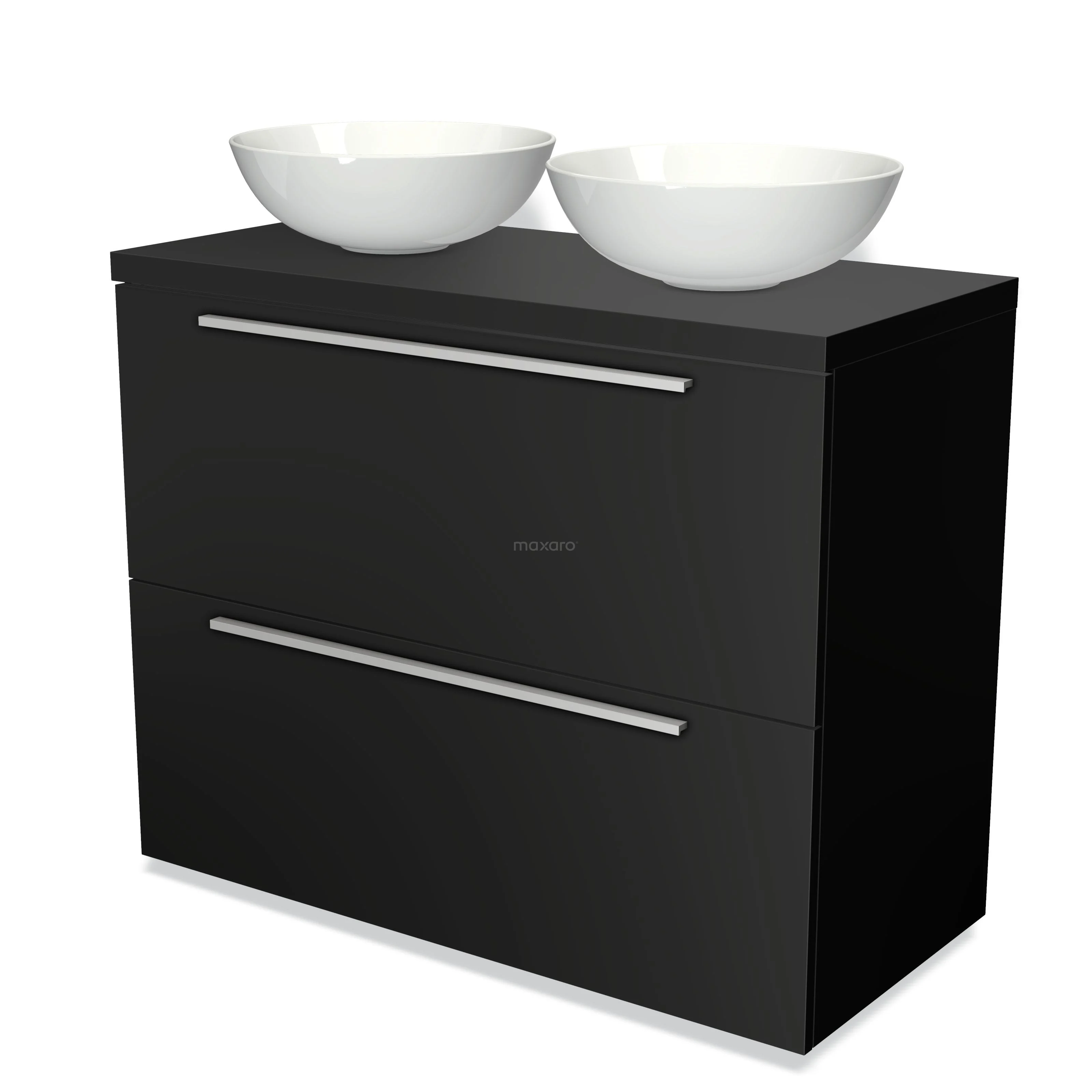 Modulo Plato Badmöbel mit Aufsatzwaschbecken | 100 cm Matt Schwarz Flach front Matt Schwarz blatt 2 hohe Schubladen übereinanderliegend