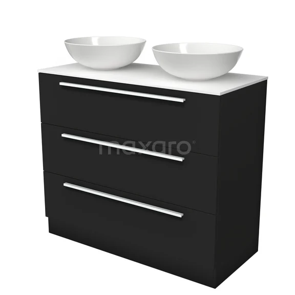Modulo Plato Badmöbel mit Aufsatzwaschbecken | 100 cm Matt Schwarz Flach front Solid Surface blatt 3 stehende Schubladen