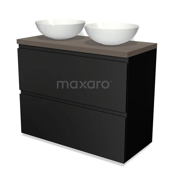 Modulo Plato Badmöbel mit Aufsatzwaschbecken | 100 cm Matt Schwarz Grifflos front Dunkelbraune Eiche blatt 2 hohe Schubladen übereinanderliegend