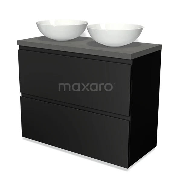 Modulo Plato Badmöbel mit Aufsatzwaschbecken | 100 cm Matt Schwarz Grifflos front Dunkelgrauer Beton blatt 2 hohe Schubladen übereinanderliegend