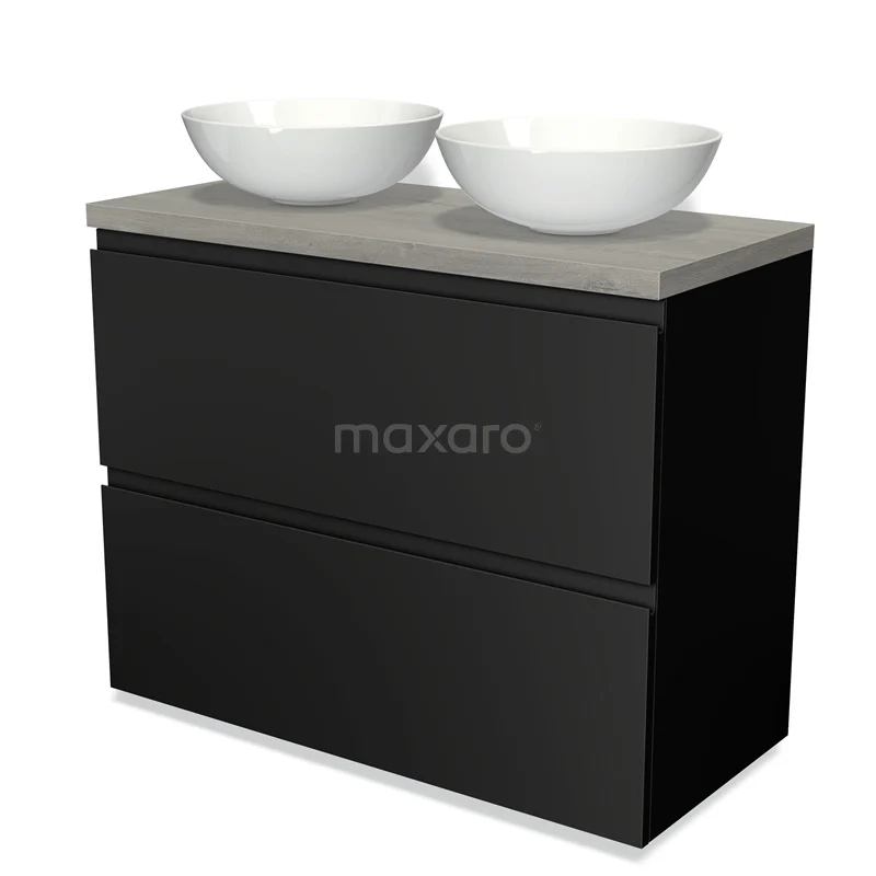 Modulo Plato Badmöbel mit Aufsatzwaschbecken | 100 cm Matt Schwarz Grifflos front Graue Eiche blatt 2 hohe Schubladen übereinanderliegend