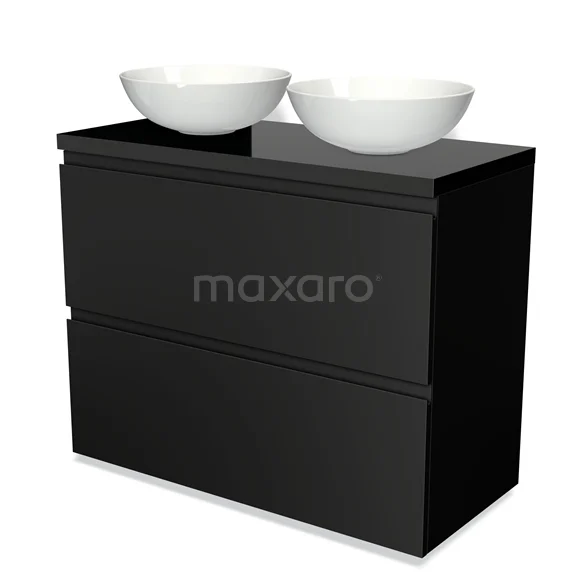 Modulo Plato Badmöbel mit Aufsatzwaschbecken | 100 cm Matt Schwarz Grifflos front Hochglanz Schwarz blatt 2 hohe Schubladen übereinanderliegend