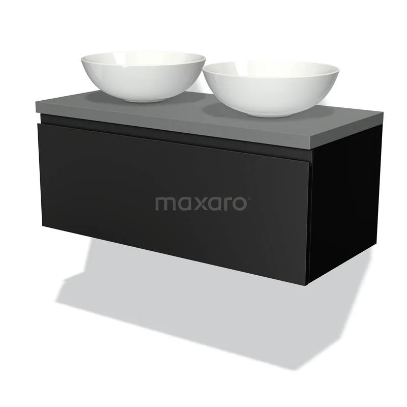 Modulo Plato Badmöbel mit Aufsatzwaschbecken | 100 cm Matt Schwarz Grifflos front Mittelgrau blatt 1 Schublade