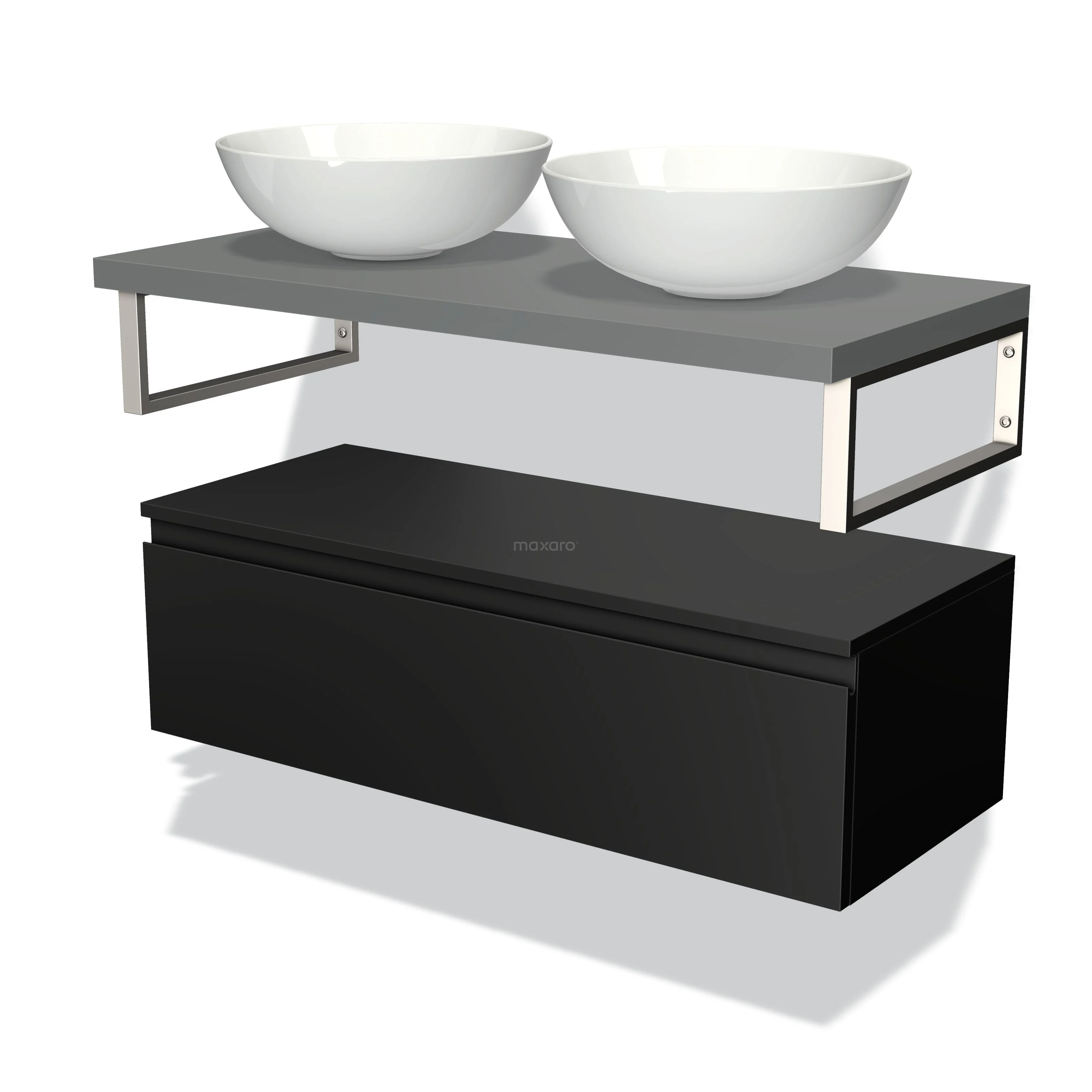 Modulo Plato Badmöbel mit Aufsatzwaschbecken | 100 cm Matt Schwarz Grifflos front Mittelgrau blatt Tief hängend