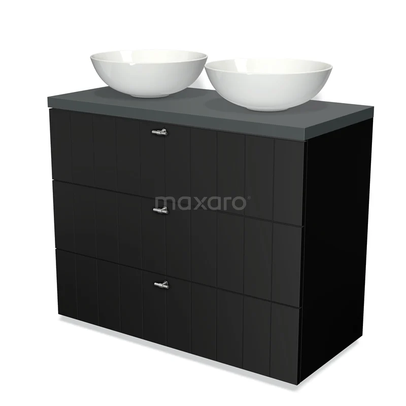 Modulo Plato Badmöbel mit Aufsatzwaschbecken | 100 cm Matt Schwarz Lamelle front Dunkelgrau blatt 3 Schubladen