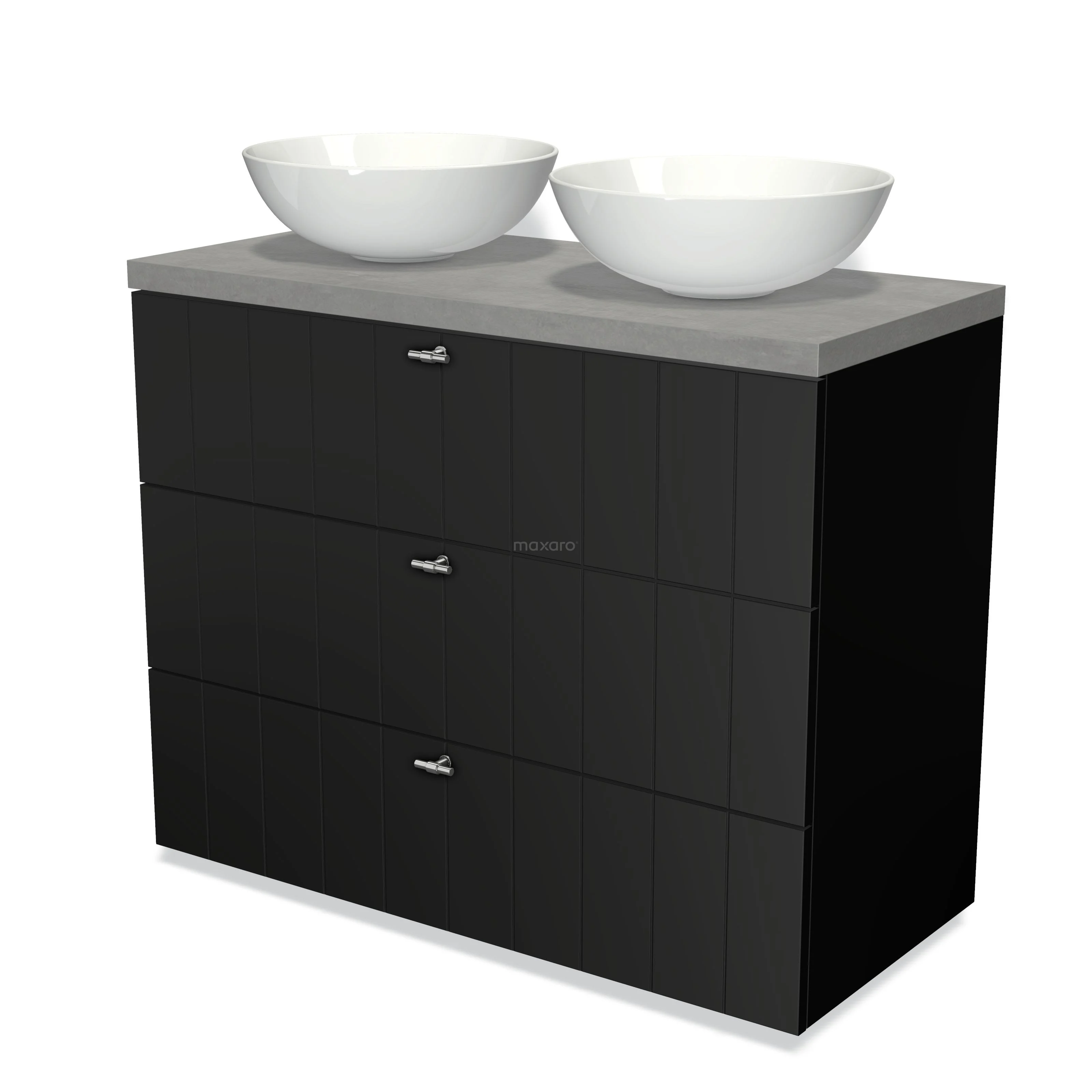 Modulo Plato Badmöbel mit Aufsatzwaschbecken | 100 cm Matt Schwarz Lamelle front Hellgrauer Beton blatt 3 Schubladen