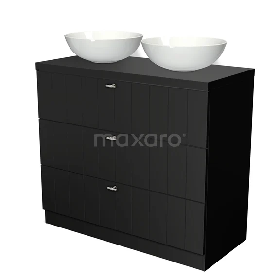 Modulo Plato Badmöbel mit Aufsatzwaschbecken | 100 cm Matt Schwarz Lamelle front Matt Schwarz blatt 3 stehende Schubladen