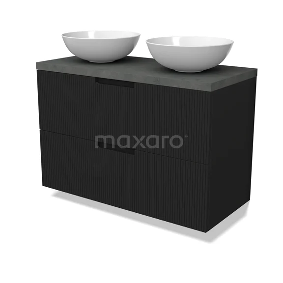Modulo Plato Badmöbel mit Aufsatzwaschbecken | 100 cm Matt Schwarz Linie front Dunkelgrauer Beton blatt 2 übereinanderliegende Schubladen