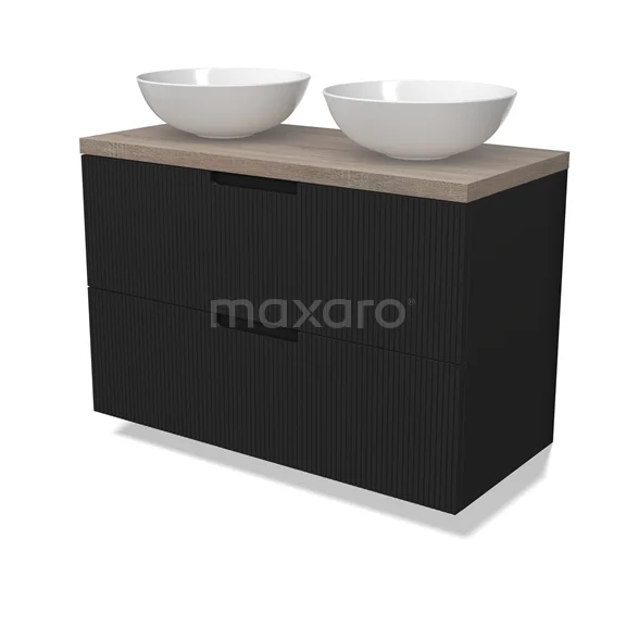 Modulo Plato Badmöbel mit Aufsatzwaschbecken | 100 cm Matt Schwarz Linie front Eiche blatt 2 übereinanderliegende Schubladen