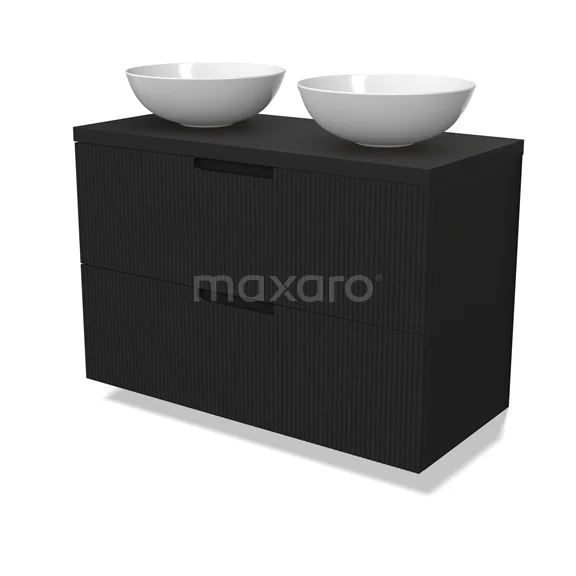 Modulo Plato Badmöbel mit Aufsatzwaschbecken | 100 cm Matt Schwarz Linie front Matt Schwarz blatt 2 übereinanderliegende Schubladen