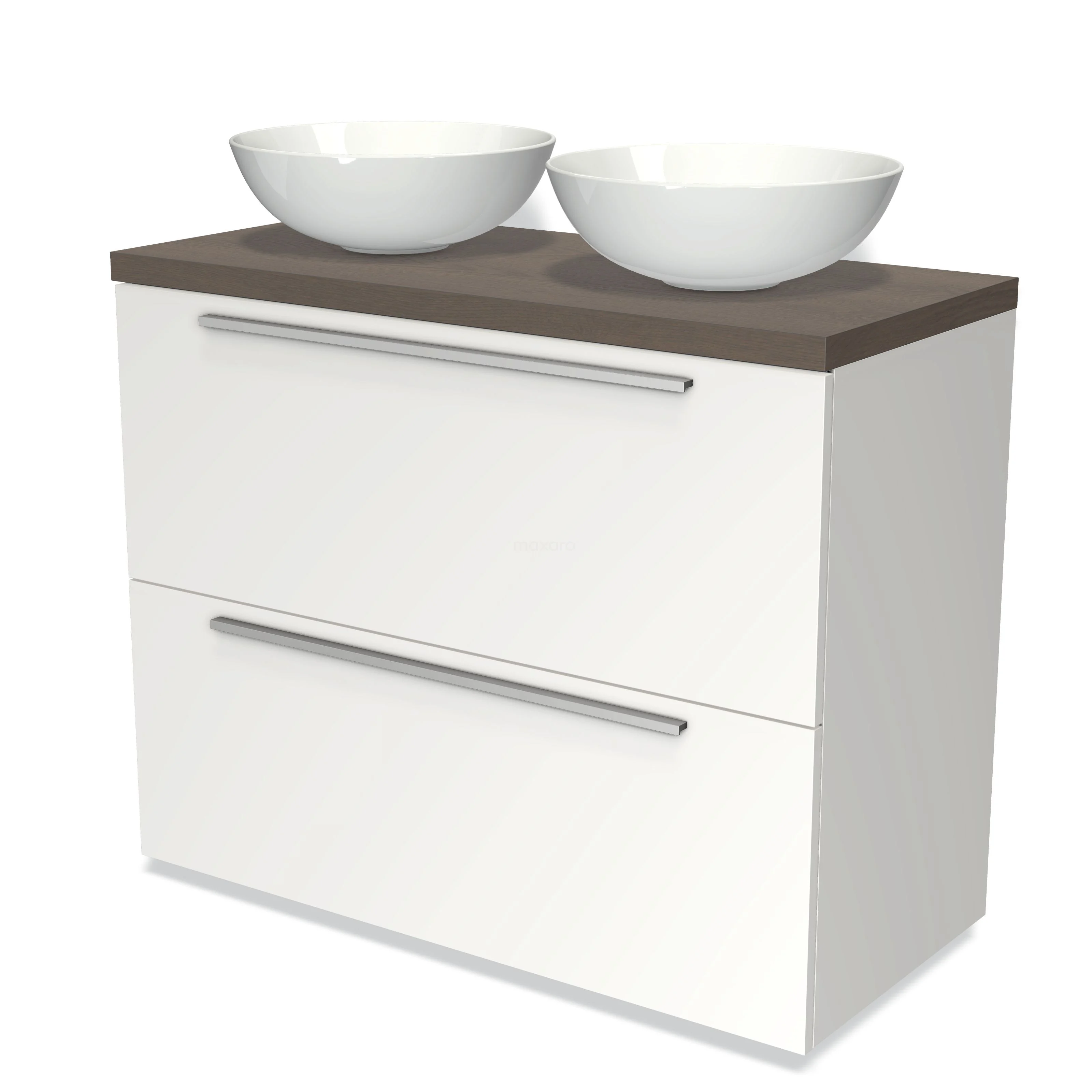 Modulo Plato Badmöbel mit Aufsatzwaschbecken | 100 cm Matt Weiß Flach front Dunkelbraune Eiche blatt 2 hohe Schubladen übereinanderliegend